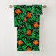 Towel set in a vintage William Morris floral damask pattern of anemone flowers and leaves, digitally enhanced and coloured - emerald green leaves, and flowers in shades of deep mandarin orange and gold on a black background