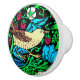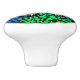 Ceramic knob in a William Morris Art Nouveau tile pattern, depicting a bird in soft beige and brown, with vivid cerulean blue flowers, green leaves, and wild strawberries, against a black background