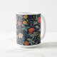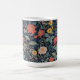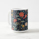A beautiful, intricate William Morris floral pattern coffee mug featuring stylized flowers in salmon, teal, yellow, and cream against a deep navy background. Perfect for adding timeless Arts Crafts decor style to any kitchen or office. This classic, rich design is ideal for fans of historic textile prints. Created by Simply Farmhouse Press.