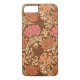 Phone case in a vintage William Morris, Art Nouveau, floral print of stylised chrysanthemums, digitally enhanced and coloured, in tan, rust terracotta, and coral, on a deep chocolate brown background
