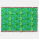 Throw blanket in a vintage William Morris, Art Nouveau, floral print of stylised chrysanthemums, digitally enhanced and coloured, in light and deep lime green and aqua, on an emerald green background