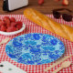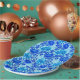 Paper plates in a vintage William Morris, Art Nouveau, floral print of stylised chrysanthemums, digitally enhanced and coloured, in shades of denim blue and deep indigo on a light blue and white background