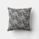 Throw pillow in a vintage William Morris damask pattern of artichoke plants and leaves, in light silver grey / grey and medium grey, against a dark graphite grey background, digitally enhanced and coloured