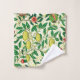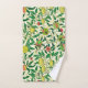 Towel set in a William Morris Art Nouveau pattern of lemons, pomegranates, and peaches, with blossoms, on leafy branches - fruit in yellow and coral orange, with green leaves, against a patterned, yellow and white background