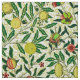 Fabric in a William Morris Art Nouveau pattern of lemons, pomegranates, and peaches, with blossoms, on leafy branches - fruit in yellow and coral orange, with green leaves, against a patterned, yellow and white background