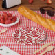Paper plates in a vintage William Morris floral damask pattern, digitally enhanced and coloured, in deep Chinese red on a white background
