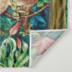 Tapestry in a William Morris design of a fox and a pheasant in flight in a fantasy forest setting of leafy green foliage and fruit trees