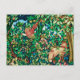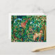Postcard in a William Morris tapestry design of a fox and a pheasant in flight in a fantasy forest setting of leafy green foliage and fruit trees
