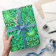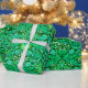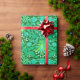 Wrapping paper in a vintage William Morris pattern of hyacinths, tulips and leaves, in shades of emerald and jade green, accented with aqua and white, on a deep forest green background