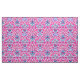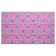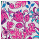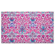 Fabric in a vintage William Morris pattern of hyacinths, tulips and leaves, in shades of fuchsia and soft pink, accented with dark blue and turquoise, on a white background