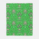 Fleece blanket in a vintage William Morris pattern of hyacinths, tulips and leaves, in shades of lime green, accented with fuchsia pink and white, on a deep emerald green background