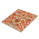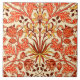 Ceramic tile in a vintage William Morris pattern of hyacinths, tulips and leaves, in shades of light to deep mandarin orange and rust, accented with chocolate brown and mustard gold, on a light beige background