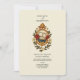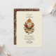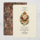 A classic Old World-style invitation featuring a regal medallion, flower laurel and two wedding rings. The back features a William Morris-esque burgundy floral print.