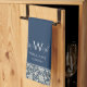 white william morris pattern,navy blue white floral,flowery swirling flower design,famous british english artist,traditional family surname flowers, "classic classy custom monogram", "personalised customised kitchen towel", "personal name swirly swirls", "elegant stylish sophisticated dishcloth", "vintage add your own text"