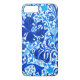 Phone case in a vintage William Morris floral print of stylised lilies and Irises, digitally enhanced and coloured, in shades of deep cobalt blue, cerulean blue, and light sky blue on a white background