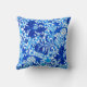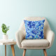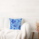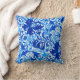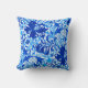 Throw pillow in a vintage William Morris floral print of stylised lilies and Irises, digitally enhanced and coloured, in shades of deep cobalt blue, cerulean blue, and light sky blue on a white background