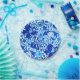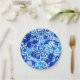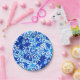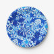 Paper plates in a vintage William Morris floral print of stylised lilies and Irises, digitally enhanced and coloured, in shades of deep cobalt blue, cerulean blue, and light sky blue on a white background