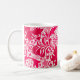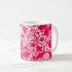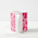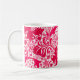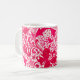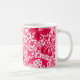 Coffee mug in a vintage William Morris floral print of stylised lilies and Irises, digitally enhanced and coloured, in shades of light to deep fuchsia pink and deep wine red on a white background