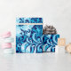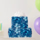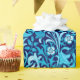 Wrapping paper in a vintage William Morris floral print of stylised lilies and Irises, digitally enhanced and coloured, in shades of sky blue and white on a dark indigo blue background