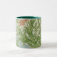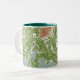 William Morris Iris Flowers Foliage Birds Blue Green Pink Two-Tone Coffee Mug - Iris, the image decorating this product was created as a wallpaper pattern in 1887 by John Dearle (1859-1932) a talented designer and an employee of William Morris (1834-1896). The pattern displays a foliate and floral design featuring iris flowers and small birds.