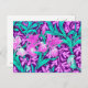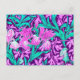 Postcard in a William Morris, Art Nouveau, textile print of irises and leaves, digitally enhanced and coloured, in soft orchid and turquoise, on a deep amethyst purple background