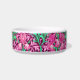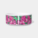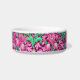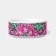 Pet bowl in a William Morris, Art Nouveau, textile print of irises and leaves, digitally enhanced and coloured, in fuchsia and ice pink, peacock green, and white, on a deep wine purple background