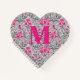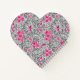Heart shaped notebook in a William Morris textile print of irises and leaves in fuchsia and light pink, with graphite and medium grey / grey leaves, on a light silver grey background , with personalised monogram