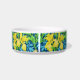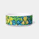Pet bowl in a William Morris, Art Nouveau, textile print of irises and leaves, digitally enhanced and coloured, in golden yellow, green, and soft blue, on a deep cobalt blue background