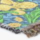 Throw in a William Morris, Art Nouveau, textile print of irises and leaves, digitally enhanced and coloured, in golden yellow, green, and soft blue, on a deep cobalt blue background