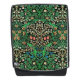 Backpack in a vintage William Morris Jacobean floral wallpaper pattern of coral pink tulips, yellow daisies, blue violets, delicate white blossoms, and jade green foliage, on a black background, digitally enhanced and coloured
