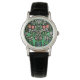 Watch in a vintage William Morris Jacobean floral wallpaper pattern of coral pink tulips, blue violets, delicate white blossoms, and jade green foliage, on a black background, digitally enhanced and coloured