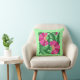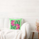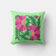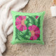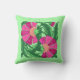 Throw pillow in a vintage William Morris Jacobean floral tile pattern, digitally enhanced and coloured, in shades of deep fuchsia pink and magenta, with emerald green leaves, on a light green background