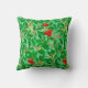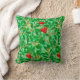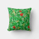 Throw pillow in a William Morris Art Nouveau textile pattern of lychee tree branches and leaves, in shades of lime and deep green, accented with red lychee fruits and yellow blossoms, on a light green background
