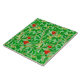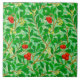 Tile in a William Morris Art Nouveau textile pattern of lychee tree branches and leaves, in shades of lime and deep green, accented with red lychee fruits and yellow blossoms, on a light green background