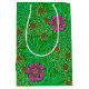 Gift bag in a vintage William Morris, Art Nouveau, marigold damask print of leaves and flowers, digitally enhanced and coloured, in deep emerald and lime green, accented with fuchsia pink and coral orange, on a dark green background