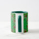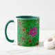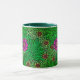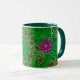 Mug in a vintage William Morris, Art Nouveau, marigold damask print of leaves and flowers, in deep emerald and lime green, accented with fuchsia pink and coral orange, on a dark green background