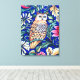 Canvas print in a William Morris Art Nouveau, tapestry pattern, featuring a tan and beige owl against fantasy flowers and leaves, with a deep cobalt blue background and border