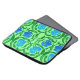 Neoprene sleeve in a vintage William Morris textile pattern of stylized pimpernel flowers and leaves - flowers in a gradient of deep to light cerulean blue, with emerald green leaves, on a light lime green background
