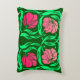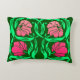 Accent pillow in a vintage William Morris textile pattern of stylised pimpernel flowers and leaves - flowers in a gradient of deep to soft coral pink, with light mint green leaves, on a dark emerald green background
