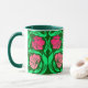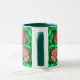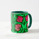 Mug in a vintage William Morris textile pattern of stylised pimpernel flowers and leaves - flowers in a gradient of deep to soft coral pink, with light mint green leaves, on a dark emerald green background