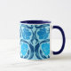 Mug in a vintage William Morris textile pattern of stylised pimpernel flowers and leaves - flowers in a gradient of light to dark denim blue on a pastel sky blue background