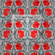 Fabric in a vintage William Morris textile pattern of stylised pimpernel flowers and leaves - flowers in a gradient of dark to bright red, with graphite grey / grey leaves, on a light silver grey background