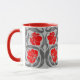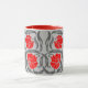 Mug in a vintage William Morris textile pattern of stylised pimpernel flowers and leaves - flowers in a gradient of dark to bright red, with graphite grey / grey leaves, on a light silver grey background