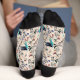 This William Morris Style was illustrated by me. I wanted to create a Hummingbird scene with whimsical flowers, branches and foliage dancing around. Cute little dragonflies fluttering around. Some of the flowers are Bleeding Hearts, Chrysanthemums and stylised wildflowers. A wonderful pair of socks for a Spring or Summer day.