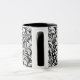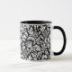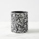 Coffee mug in a vintage William Morris damask pattern of thistle flowers and leaves, in white, on a black background, digitally enhanced and coloured