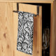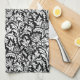 Kitchen towel in a vintage William Morris damask pattern of thistle flowers and leaves, in white, on a black background, digitally enhanced and coloured