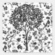 Sticker in a William Morris Art Nouveau take on a traditional "tree of life" pattern, featuring fantasy trees surrounded by branches filled with exotic flowers and birds, black and shades of grey / grey, on a white background