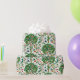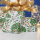 Wrapping paper in a William Morris Art Nouveau take on a traditional "tree of life" pattern, featuring fantasy trees surrounded by branches filled with exotic flowers and birds, shades of emerald green, tan, gold, red, and turquoise blue, on a white background