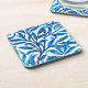 Coasters in a vintage William Morris pattern of stylized willow branches, in shades of cobalt and cerulean blue with dark indigo, on a white background