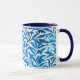 Mug in a vintage William Morris pattern of stylised willow branches, in shades of cobalt and cerulean blue with dark indigo, on a white background